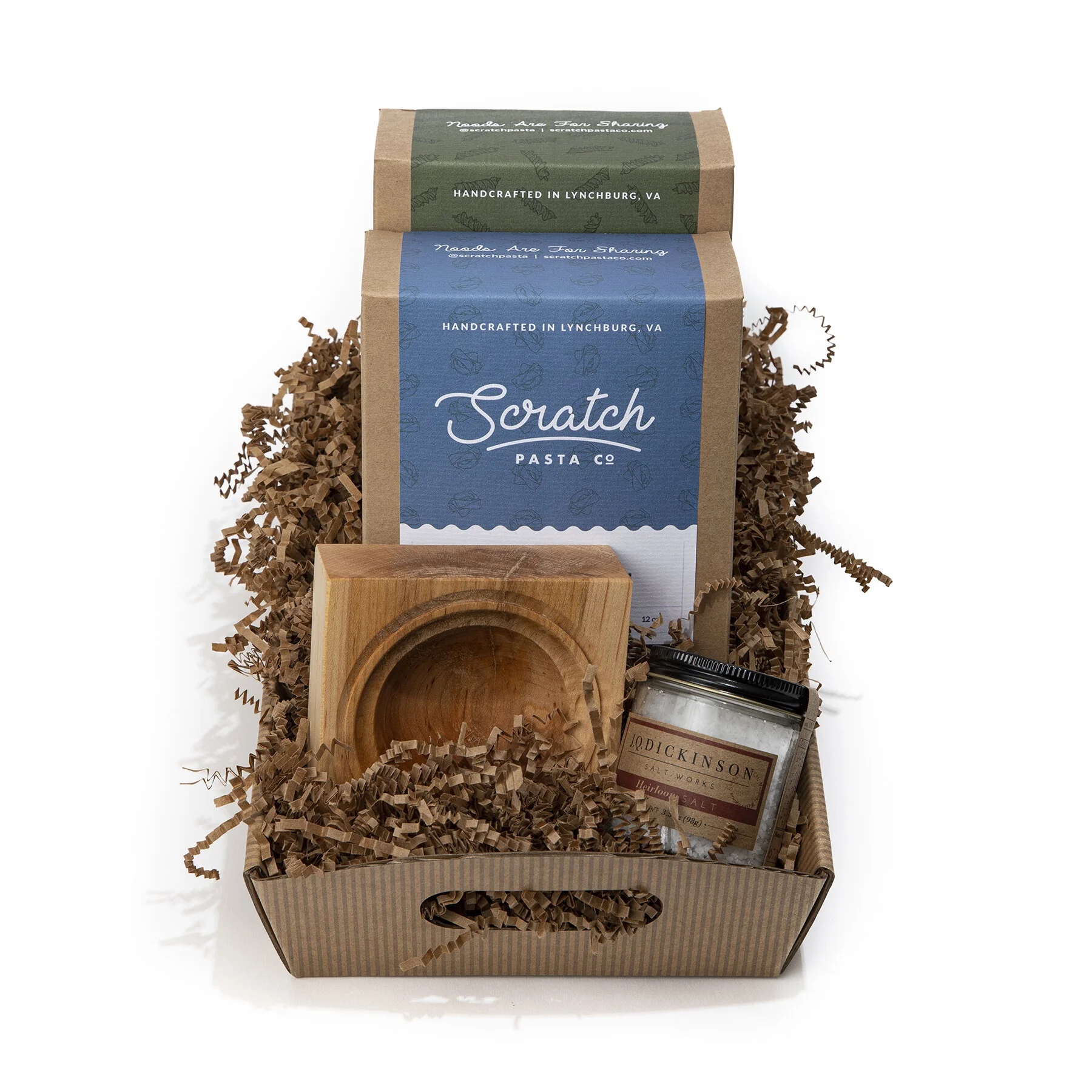 We’ve got your holiday gift-giving covered. Our Foodie Gift Box might be small but it is mighty. Included are 2 boxes of pasta—our Semolina Pappardelle, and Spinach Fusilli—a locally made maple salt cellar, and Heirloom Finishing Salt from our friends at J.Q. Dickinson. This gift box is the easy choice for the foodie in your life.